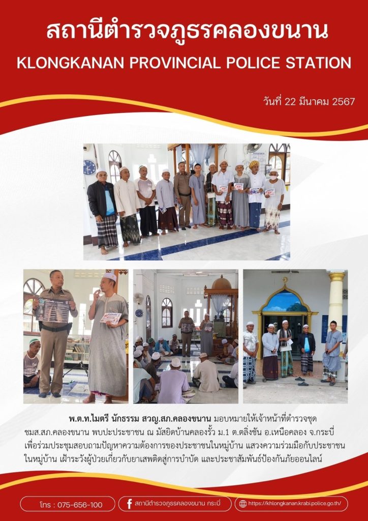 ได้สั่งการให้ร.ต.อ.วิชิต สุดรักษ์ รองสวป.สภ.คลองขนาน พร้อมด้วย , ชุดปฎิบัติการ ชมส.สภ.คลองขนาน และสายตรวจตำบลตลิ่งชัน พบปะประชาชนบ้านคลองรั้ว ณ มัสยิดบ้านคลองรั้ว หมู่ที่ 1 ต.ตลิ่งชัน อ.เหนือคลอง จ.กระบี่ – ร่วมประชุม สอบถามปัญหาความต้องการของประชาชน ในหมู่บ้าน ที่ต้องการให้ทาง สภ.คลองขนาน ร่วมกันแก้ใขปัญหา -แสวงความร่วมมือกับประชาชนในหมู่ เฝ้าระวังผู้ป่วยเกี่ยวยาเสพติด สู่การบำบัด – การประชาสัมพันธ์ การป้องกันภัยทางสื่อออนไลน์ ผลการปฏิบัติเป็นไปด้วยความเรียบร้อย จึงเรียนมาเพื่อโปรดทราบ