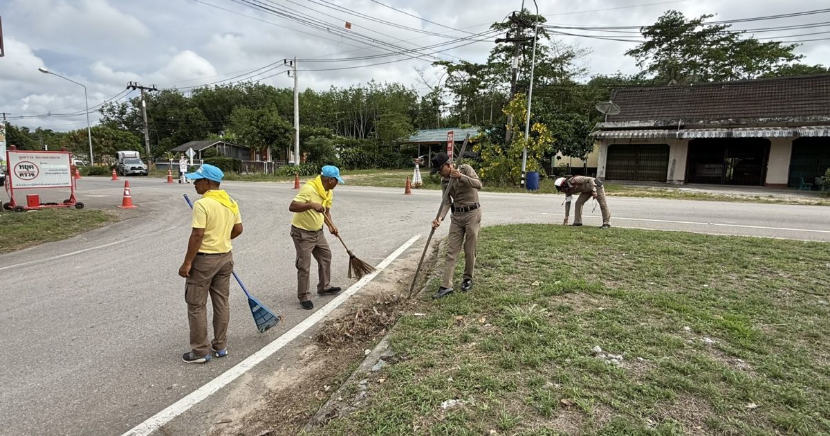 จิตอาสาทำความสะอาดเกาะกลางถนนข้างที่พักสายตรวจตำบลคลองขนานช่วงเทศกาลสงกรานต์ 2568